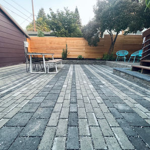 Before excavation this yard was a giant mogul of discarded dirt overgrown with grass and weeds waist high. Clients were looking for a more even and level space to entertain while still minding the existing elevations of their detached garage, driveway and steps. Instead of opting for new stairs to be built they decided on option 2 of a decorative capstone over a part of their wall to help distinguish it as a step. the unique pattern was designed by the owner as an ode to his career in programming, a very cool way to put a unique and special touch on a project!