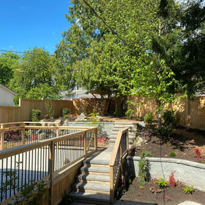 This projects main focus was rehabilitation, our clients enjoyed the existing layout of their yard but unfortunately everything had fallen into disrepair and had a general appearance of neglect and disarray. We rebuilt their deck using cedar with an aluminum ballast railing and cement treaded steps to tie in with the new walls that were constructed. We also helped more clearly define each elevation and made it more usable by making the retaining walls higher.